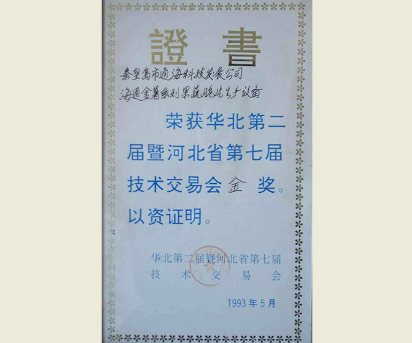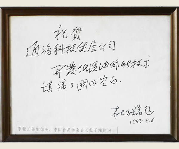 ★1993年8月,全国首届食物结构改革与市场发展研讨会在北戴河召开,由中国食品工业协会主办,国内几十位食品界专家、知名食品企业代表及各省市食协负责人参会,会上本公司发布了初期成果。当时,原轻工部副部长、中国食品工业协会会长杜子端先生,对我公司成果给予高度重视和评价,并约见本公司总工程师韩国刚,听取汇报后为本公司题词:“祝贺通海科技发展公司,开发低温油炸新技术,填补了国内空白”。