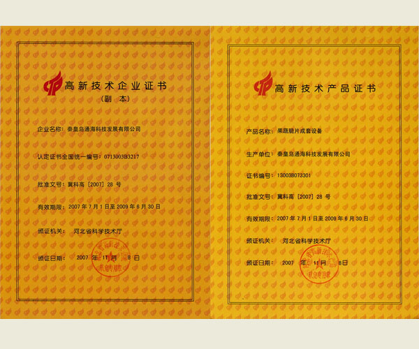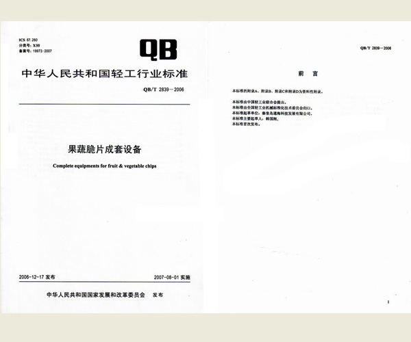 ★2003年接受中国轻工机械标准化委员会任务,本公司起草《中华人民共和国轻工行业标准—果蔬脆片成套设备 QB/T 2839-2006》,已于2006年12月17日颁布,2007年8月1日实施。