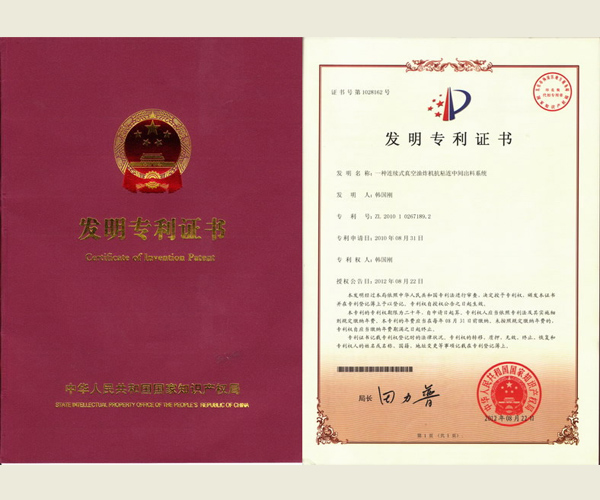 ★2012年8月22日,“连续式真空油炸机抗粘连中间出料系统”获得发明专利权;